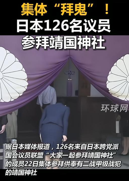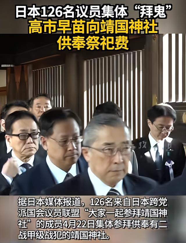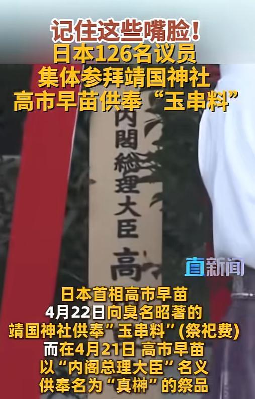 4月22日日本首相高市早苗以内阁总理大臣名义,向供奉二战甲级战犯的靖国神社供奉真神祭品,126名日本国会议员紧随其后集体参拜。